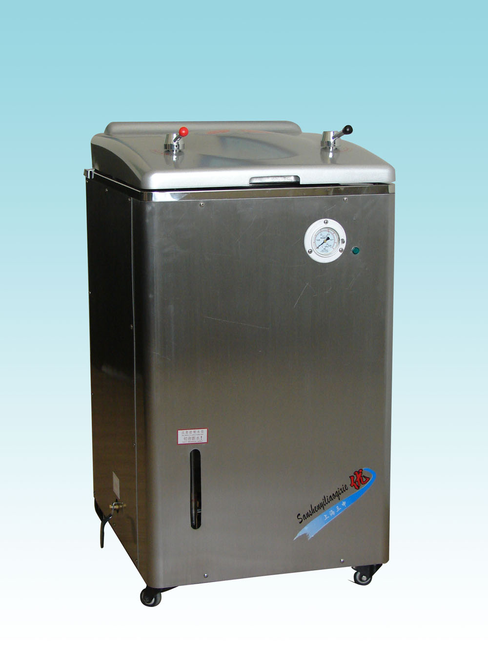 不銹鋼材質(zhì)制成,經(jīng)久耐用;輕啟翻蓋結(jié)構(gòu),輕松省力;人工加水,玻璃液位管顯示水位;重力排汽法設計,腔內(nèi)純蒸汽環(huán)境,滅菌效果可靠;徑向自脹式硅橡膠密封圈,密封效果好,使用壽命長;安全閥間歇性排氣,自動控制器壓力和溫度;壓力表同時顯示桶內(nèi)壓力和溫度,清晰明了;放水閥可以排放桶內(nèi)濃縮水,防止結(jié)垢;帶剎車的萬向腳輪移位輕捷,定位方便,浸入式電加熱管,熱效率高。
